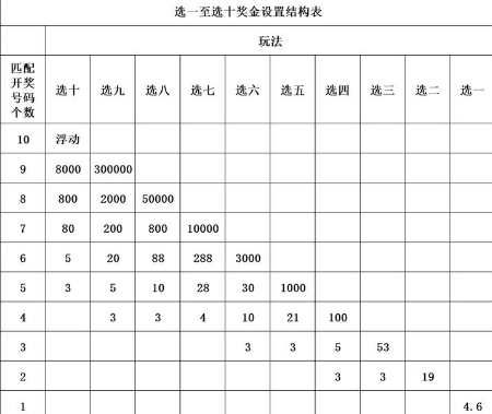 选十: 玩家选择十个号码进行投注,中奖条件是开奖号码与所选号码相符,中奖赔率为浮动奖金,封顶为500万元。