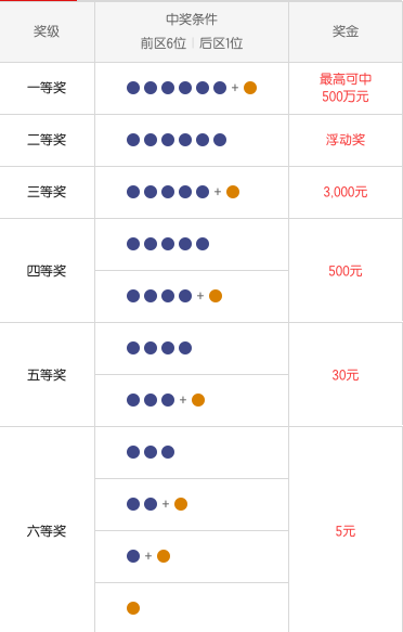 七星彩设有六个奖级,每个奖级对应不同的奖金。一等奖和二等奖的奖金由当期奖金额减去固定奖总额后的比例确定,分别为90%和10%。三至六等奖的奖金为固定金额,分别为3000元、500元、30元和5元。
