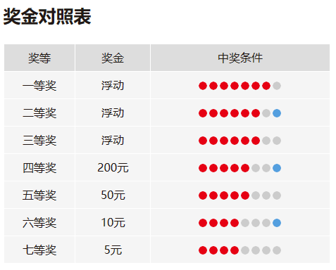 七等奖:单注奖金额固定为5元。七等奖的固定奖金额度相对较小,但增加了中奖的机会。