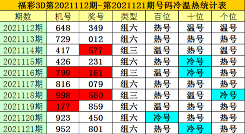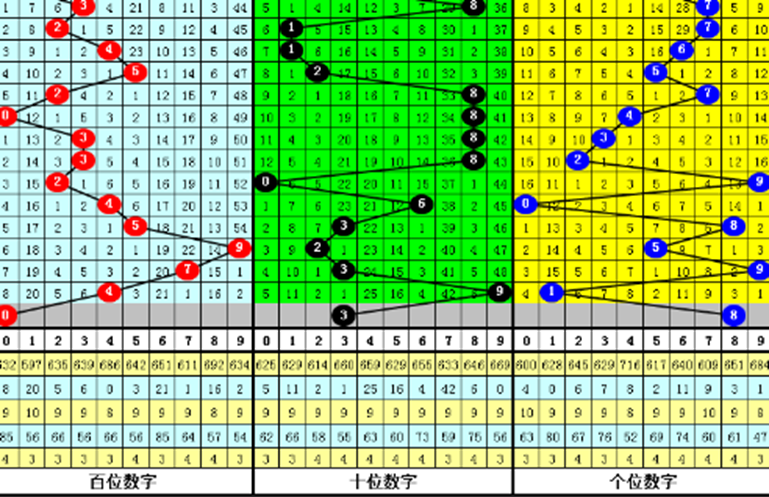 - 中奖号码走势图:按照个、十、百位分别标出中奖号码在每个位置出现的情况,出现次数多的即为热号,出现次数少的即为冷号。