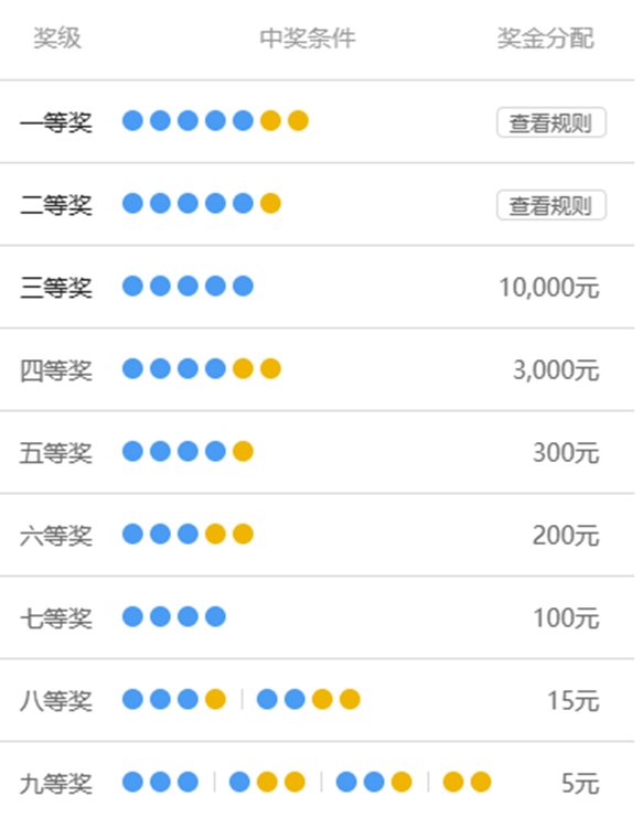 六等奖: 前区选择的号码中至少有1个匹配,且后区选择的号码至少有一个匹配。