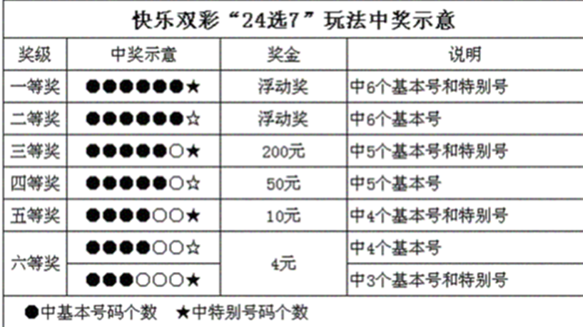24选7玩法奖级分为浮动奖和固定奖。一等奖、二等奖为浮动奖,三至六等奖为固定奖。