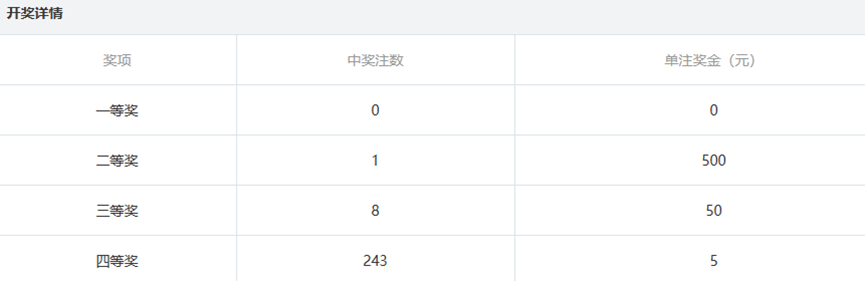 二等奖:相同位置连续4位号码与中奖号码一样。单注固定奖金为500元。