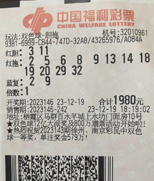 在12月19日傍晚,夏先生在离开南京回家前,按照往常的习惯来到32010961站点。他花费1980元,选择了2胆12拖+2个蓝球的自选复式投注方式,购买了一张彩票。