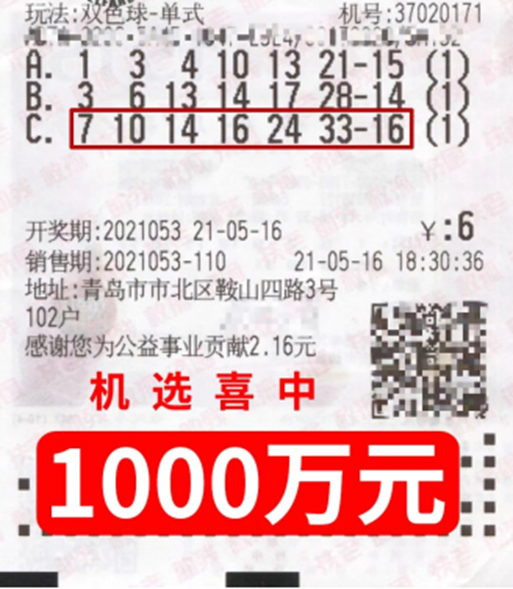 双色球1000万大奖得主是谁?在双色球第2021053期开奖中,山东青岛中出一注千万元头奖,幸运儿丁先生通过在市北区的站点购买的机选单式票,以6元的投注金额获得了1000万元的大奖。这位在青岛工作多年的外乡人平时热爱购彩,工作之余常去身边的站购买刮刮乐和偶尔购买双色球。
