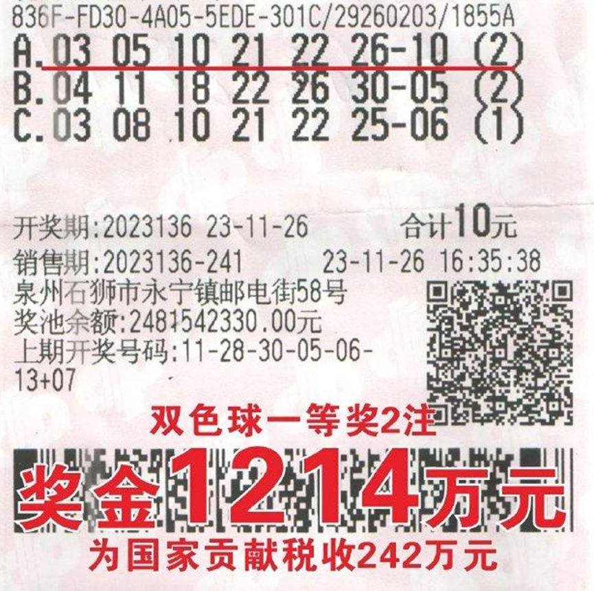 双色球1214万奖金得主是谁?泉州石狮市的许先生凭借一张守号3个月的单式票,竟然中得2注双色球一等奖,收获千万大奖,运气实在是爆棚!这个幸运的大奖产生于11月26日的双色球第2023136期,中奖站点位于泉州石狮市永宁镇邮电街58号的福彩35051924站点。