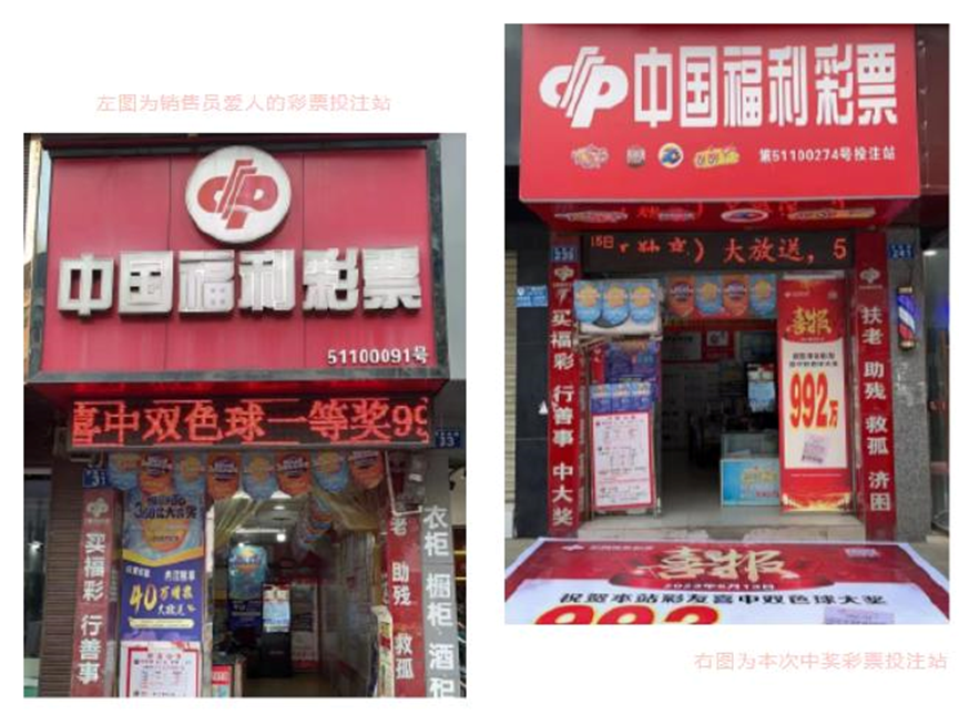 这位销售员与爱人分别经营了一家福彩店,而他的爱人的站点早在2013年9月3日曾中出过双色球第2013103期一等奖,奖金合计832万元。如今,他也迎来了属于自己站点的辉煌时刻,中出了992万元的大奖。