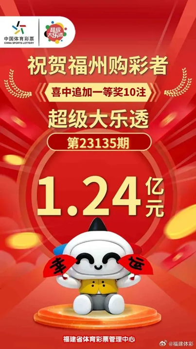 值得一提的是,这10注追加一等奖全部出自福建福州市同一家体彩实体店,为同一位幸运彩民所中得。这位幸运儿凭借一张10倍追加投注的单式票,一人独中10注追加投注,共计获得了1.24亿元的丰厚奖金。