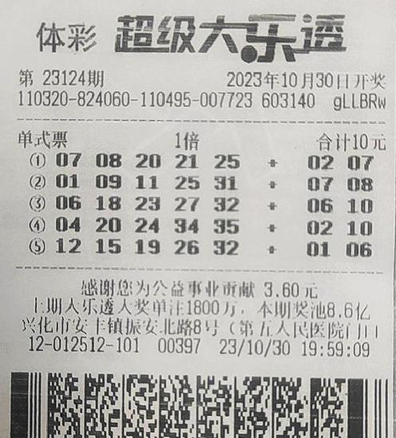 当晚,大乐透23124期揭晓,作为大乐透1000万奖金得主,郝先生的第3注号码“06、18、23、27、32+06、10”竟然与当期中奖号码完全吻合。