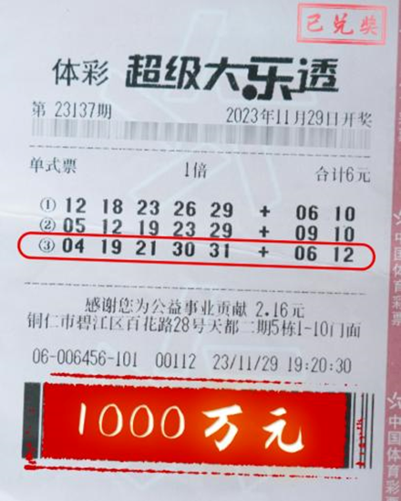 大乐透1000万奖金得主是谁?贵州省铜仁市一位购彩者成功揽得大乐透百万元大奖,成为该市体彩站点幸运的大奖得主。铜仁市碧江区百花路28号天都二期5栋1-10门面5206006456站点,一位名为刘先生的购彩者购买了一张1倍投注单式票,成功中得1000万元的大奖。