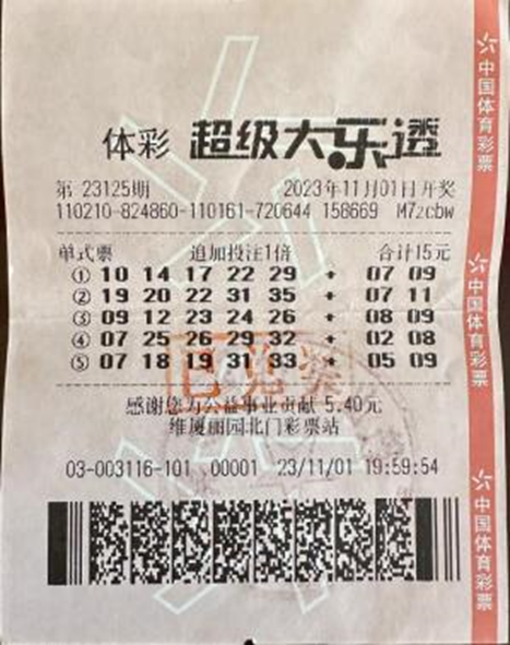 2023年11月1日,体彩超级大乐透第23125期揭晓,开奖号码为“07、25、26、29、32 + 02、08”。当期全国仅有1注1800万元追加投注一等奖,而这唯一的大奖花落在辽宁鞍山的第2103003116号体彩店。
