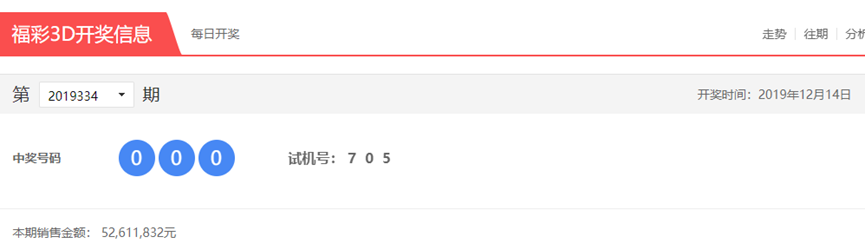 12月14日晚,福彩3D游戏第2019334期揭晓,当期号码为:000。青浦区卫中路63号和盈港路670号的福彩销售点传来好消息:售出的三张彩票分别中得51万元、26万元、26万元,而这些大奖都属于同一位幸运的彩民。