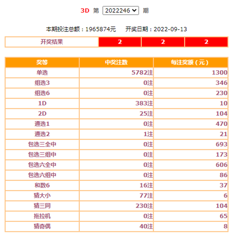 9月13日,福彩3D游戏第2022246期,中奖号码为“222”。丹东市凤城的一位幸运彩友,老刘,累计中得当期单选1600注,独揽奖金166.4万元。他购买了4张彩票,总投注金额为3200元,分别在凤城翰墨道口附近和老爷庙附近的两个代销站购得。