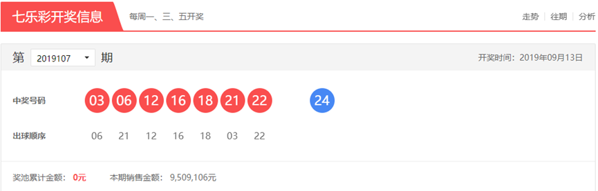 七乐彩489万奖金得主是谁?9月13日晚,七乐彩第2019107期的开奖号码为03、06、12、16、18、21、22,特别号码是24。这一期全国只中出了一注头奖,幸运的彩民来自吉林,夺得了489万元的头奖。