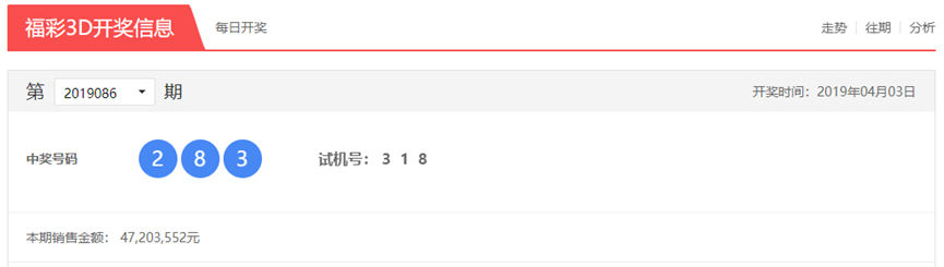 于是,他毫不犹豫地进行了“283”的十倍投注,为了保险起见,还进行了一注“238”的组六投注。结果在当晚的3D第2019086期开奖中,“283”号码竟然全部中奖,总奖金达到10573元。兑奖完毕后,王先生调侃道:“这次中奖感觉真是痛快,现在最大的心愿就是早日中得双色球大奖!”