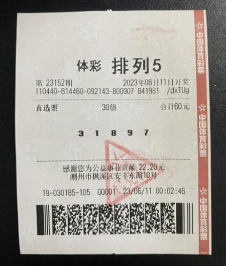 排列五300万奖金得主是谁?6月11日,潮州市枫溪镇安丰东路10号体彩实体店4419030185站传来了一则喜讯:一位购彩者成功中得排列5一等奖30注,幸运揽获奖金300万元,同时为潮州市贡献税收60万元。开奖次日,中奖者李先生亲临潮州市体彩中心兑奖,展现了他对体育彩票的热爱和忠实。