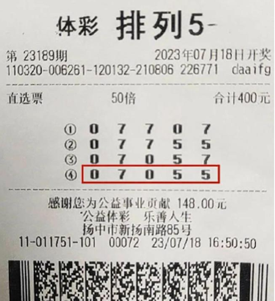 大约两个星期之后,来到了7月18日排列5第23189期的开奖日。当期的中奖号码竟然是“07055”,与何先生投注的第4注号码完全一致。由于他采用了50倍的倍投,最终的总奖金达到了500万元,让何先生惊喜不已。