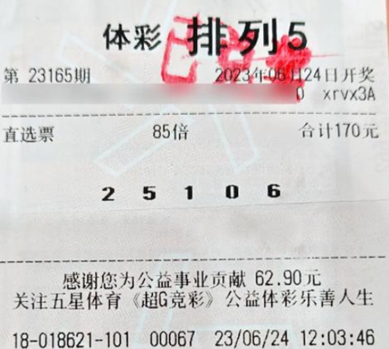 排列五850万大奖得主是谁?6月24日,体彩排列5第23165期开奖,开奖号码“2、5、1、0、6”传来了喜讯。在奉贤区南桥镇育秀路19号体彩销售网点,一位幸运购彩者凭借一张85倍的单式直选票,成功喜中排列5一等奖85注,梦寐以求的奖金高达850万元。