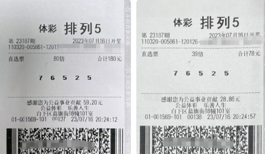 张先生的中奖号码是“76525”,他购买了两张彩票,分别进行了80倍和39倍的倍投,合共119倍。当晚,排列5第23187期的开奖号码竟然是“76525”,让张先生一举中得119注一等奖,每注奖金10万元,总奖金高达1190万元。