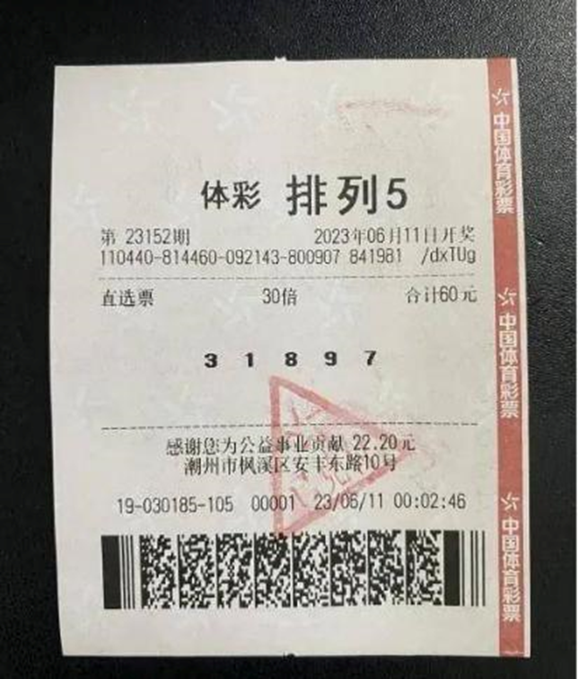 体彩排列五300万奖金得主是谁?潮州市枫溪镇安丰东路10号体彩实体店4419030185站于6月11日传来好消息,一位购彩者李先生中得排列5一等奖30注,总奖金高达300万元。李先生选择在开奖次日一早前去领取这笔喜讯,为潮州市贡献税收60万元。