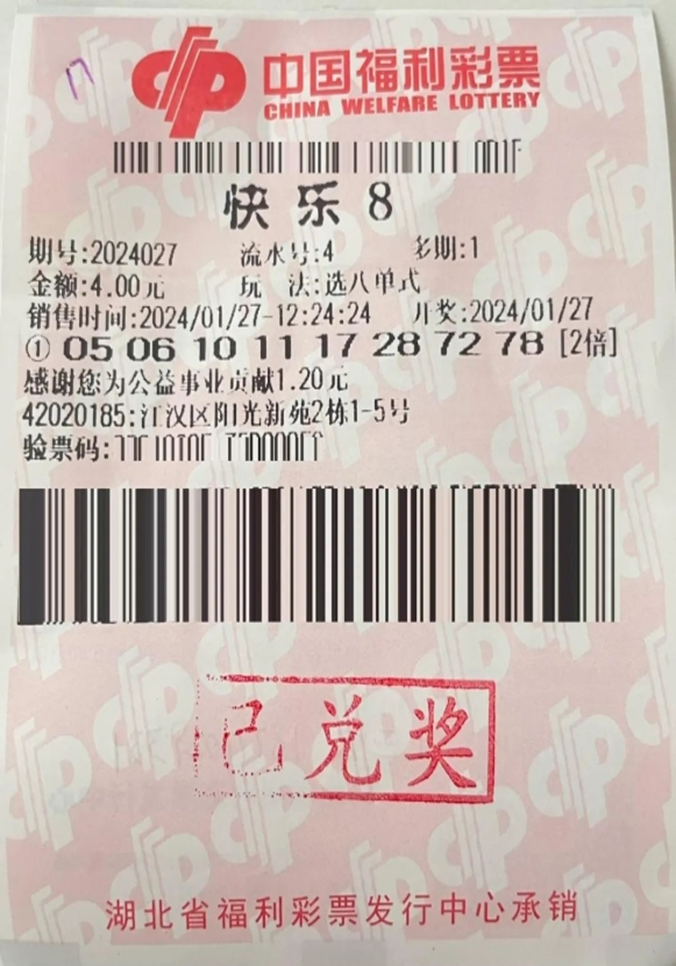 快乐8奖金10万得主是谁?近日,武汉汉口的罗先生中得了2024027期快乐8游戏选八玩法的大奖,共有2注,奖金高达10万元。在1月29日上午,他携妻前往湖北福彩武汉江北管理站兑奖。这桩喜事中,罗先生笑着表示:“这个奖金由我妻子来领,感谢她这一年来对家庭的辛勤付出。”