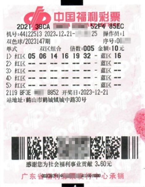 双色球133万奖金得主是谁?2023年12月21日,双色球第2023147期开奖,江门市鹤山鹤城镇城中路30号福彩销售站44122513号售出的一张彩票中得二等奖,总奖金1335660元。而这张幸运的彩票的主人,于2024年1月15日现身江门市福彩中心,完成了兑奖手续。